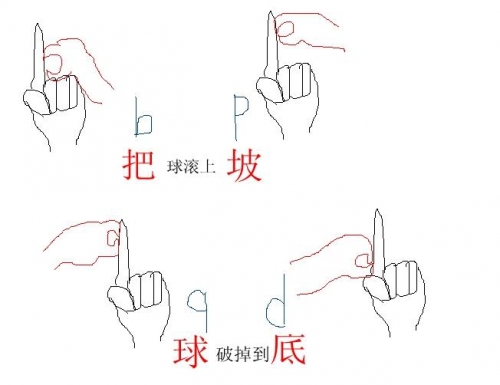 前几天婷开始学习声母了,不太容易记牢。我想想,bpdq确实很容易混,于是有一天晚上,我们俩一起开动脑筋,想一些简单的方法来记忆。当时有些是婷已经记住的,有些还不太牢,有些还没学,我们索性一起发挥想象,把字形、发音联系起来,便于记忆。