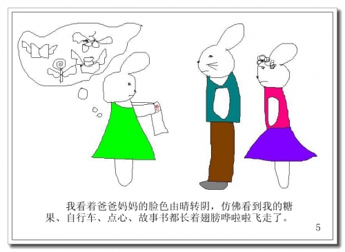 我看着爸爸妈妈的脸色由晴转阴,仿佛看到我的糖果、自行车、点心、故事书都长着翅膀哗啦啦飞走了。
