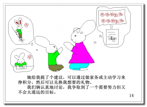 她给我提了个建议,可以通过做家务或主动学习来挣积分,然后可以兑换我想要的礼物。我们俩认真地讨论,我争取到了一个需要努力但又不会太遥远的目标。