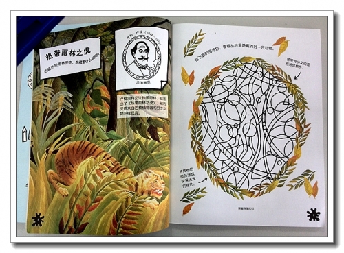 里面的游戏有的是动脑的,有的是动手的,穿插着艺术作品展示和一些作者的简单介绍,让你能了解更多的小知识。比如,卢梭,他没有见过热带雨林,却画出了《热带雨林之虎》,灵感竟然来自植物园和毛绒玩具,这太让人捧腹了,孩子听了一定会开怀大笑,正好,我们可以引导他们,也来创作一幅。