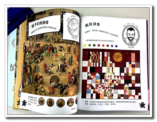 找不同、涂色、连线画、迷宫、涂色,书后面附有贴纸,可以刻印的模板,听起来是我们经常在游戏书里能见到的内容,可是作者很巧妙得与艺术作品、艺术家结合在一起,让游戏更加符合主题,同时不知不觉中欣赏了艺术作品,了解了作者信息,了解他们作品的个性与特点。