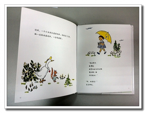 开本比A4纸的一半宽点,30页左右,硬皮精装,质量很好。画风简洁可爱,颜色搭配明亮,极富童趣,空间留白不少,整体布局开朗空旷,赏心悦目。文字中等,篇幅略长