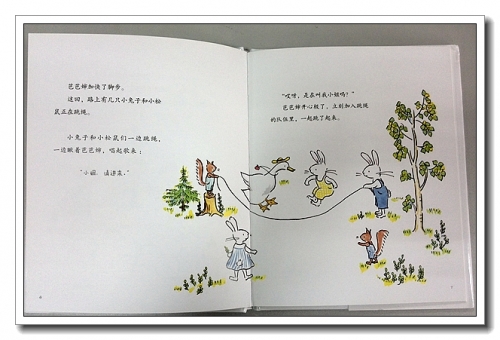 作者的画工很好,简单几笔,神态尽展,也许是因为老叫婷“婷婷兔”的原因,特别喜欢那几只跳绳的兔子,清新的衣服图案,活泼的表情动作,一幅孩童嬉戏的场面跃然纸上,也带我回忆起童年的快乐。