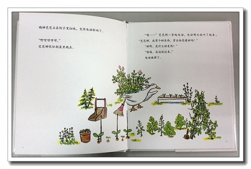 故事开头,鸭婶芭芭正在扫地,电话铃响,有人告诉她说,要给她看个好东西。可是这个人却没说自己是谁。故事当然是为了留有悬念,但是在生活中,小朋友可不要象这样子打电话哦。客人来了,当然要好好招待,鸭婶芭芭家里没有好吃的了,她要出门去采购。
