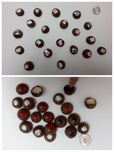 夏果壳背面贴上颜色,后来证明贴得不牢靠,还是绘制上去比较靠谱,家里没有丙烯,用炫彩棒涂的,刷了点透明的指甲油作保护层。八个白蛋,八个红蛋,四个黑蛋。一个钢崩儿正反面贴上红蛋白蛋,扔或者转,落下来是什么颜色,然后翻果壳,翻过来对应颜色可以取走,不对应不能取,黑蛋是坏蛋,大家得赶紧捂鼻子。错了有惩罚。看谁先收集够4颗蛋,赢了的可以绕着桌子咯咯蛋的走一圈。