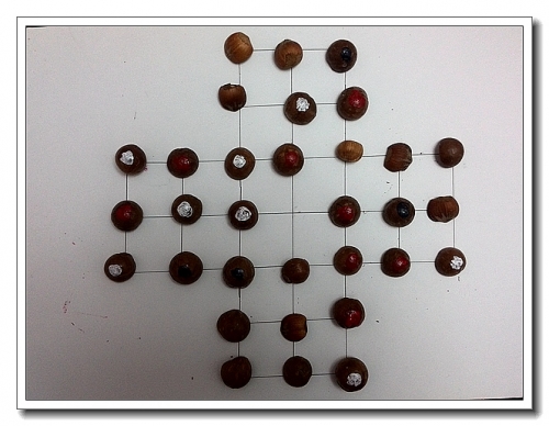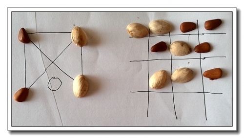 过年了,一堆干果,吃完了一堆果壳。想起了小时候玩的棋,冈字下面画个圈儿,我们叫它“跳茅坑”。给婷说了,果然对“茅坑”一词兴趣极大。