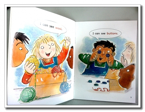 譬如《Josie and the Junk Box》,前面看到每个小孩子在找东西,有的找到毛线,有的找到扣子,有的瓶子、吸管、盒子,然后小朋友们动手装饰,我还没反应过来,翻过来,却看到了一个小怪物,这根本就是一本手工书嘛,短小的故事也能给出这样的效果。还有《The Play》,3个孩子扮演国王警察盗贼,简单的对话却完成了一个小剧场,而且给我一种启发,果然是不在于你会说多少,更在于你能根据场景表达出多少,这样一部小戏,全家上阵,每人记两句就能一起演。