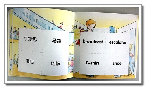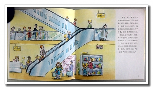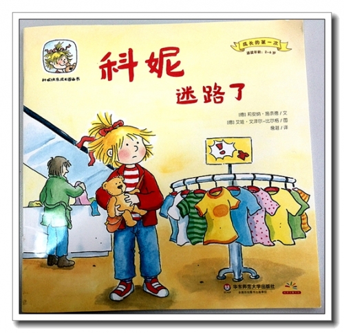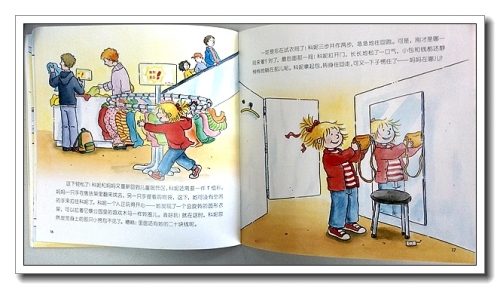 看这样的书,能让我们了解一些国外的习俗——第一天上学的时候,要准备糖果袋(这可吸引婷了,非要我也给她准备一个);去鞋店买鞋,要先用量脚器量脚(德国果然严谨)。还能教给孩子一些安全意识——科妮为了让滑梯更滑,在上面洒上了肥皂水,结果碰伤了腿;逛商店没有紧紧跟着妈妈,结果走失了两次。故事也给家长和孩子一些提示,当发生走失的时候,孩子应该去寻找售货员或收银员的帮助,而家长应该让孩子寻找一个明显的标志,故事中的标志是科妮特别感兴趣的自动扶梯,她印象深刻,容易找到;最主要的,当孩子害怕的时候,责备起不到任何作用,安慰是必须的,然后讲讲应对措施,孩子在忘记恐惧的同时,也能牢牢记住该如何防患。