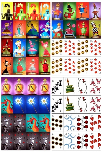 其中:国王用来唤醒皇后,骑士抢公主,火龙保护公主,催眠药水让公主继续沉睡,魔法棒解除催眠。小丑可以在牌堆里起一张,如果是功能牌,就自己拿到手,如果是数字牌,就从自己开始,顺时针转,转到谁,谁唤醒一位公主。数字牌可以打出,然后重新补牌。可以出单张,可以出一对,可以出能组成加法的3张及以上的数字牌。