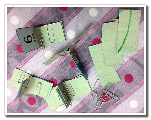 这个东西做起来也简单,婷看我做了一次,就学会了。三张纸片,两张对折,背靠背放,一张当底儿,可以粘在一起,也可以用橡皮筋,我手头只有曲别针,而且我为了拆得方便(不占地方),就用它了。做成圆形会更好看,但我何止是懒得剪圆形了,甚至各个长方形都长宽不一样,反正也不是为了好看。