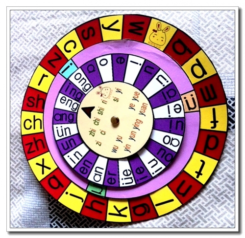 觉得卡片容易丢,顺手做了个拼音转盘来,但好像不是特别招婷喜欢。玩的过程中才发现ü给弄反了,懒得重新打印了,就撕下来重贴了一下。倒是把图纸改过来了。婷有天回来说,老师拿她的拼音转盘做游戏了,很开心。