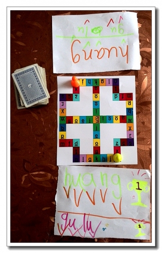 拼音棋:灵感来自飞行棋。两人队战,选择一个或几个字,写出拼音(熟练了可不写出来),还需要一副扑克。每人起6张牌,可以出任意牌数加减法,然后走对应的次数,每次可补一张牌,看谁先取回自己需要的所有字母。这个可以改成英语版。
