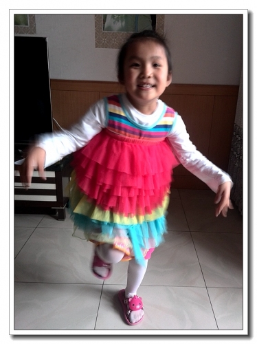 这不是“一条”裙子,这是6条裙子。婷要我给她买彩虹裙,网上看了许久,也没有什么很满意的。那天心血来潮,给婷把几条半身裙都穿在了身上。玫红、黄、蓝、深粉、绿、粉,满足了婷的要求,高兴得又蹦又跳。