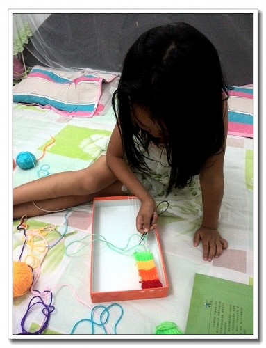 上次去参加少儿舞蹈赛初赛,结束后带着婷转转看其他展位。婷看到有家教育机构在做宣传,其中有一个彩虹织布机。几根棍子做的,拉上绳子,彩线穿梭,编成彩色的布。前天没事,想起来教婷织“布”。