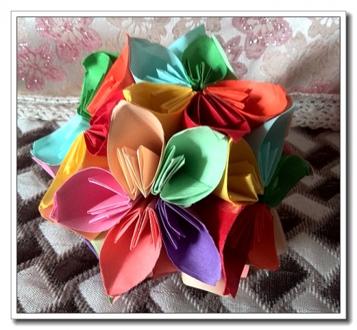正方形的纸(好像是15*15)的,一张纸可以裁成4块,做4个花瓣;一朵花5瓣;12朵花一个球,用了15张纸。按婷的要求,只选了这几种色和这样的搭配。
