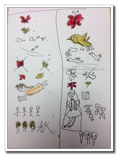 看图说话(左边是我画的,右边是婷的,为了背课文嘛,当然就很粗糙了):