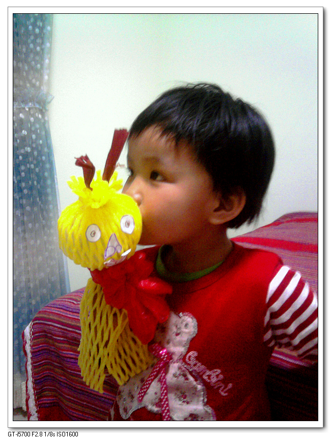 从厨房里搜到一个装完西瓜的黄色包装袋,拿来给宝宝当帽子玩了一会儿,心血来潮,里面塞了三个塑料袋进去,又找到个红色塑料袋当蝴蝶结,宝宝画了表情,剪下来粘上——好丑的娃娃啊。超级简单,超级不浪费。