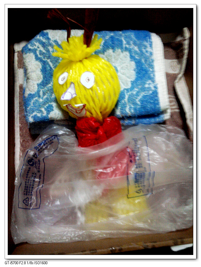 将环保进行到底,连身上的被子都是塑料袋,完全的废物利用啊。这个丑娃娃宝宝很玩了一会儿过家家,可惜后来在跟我抢这照顾它的过程中把头给撕破了,才不得不扔掉,呵呵。
