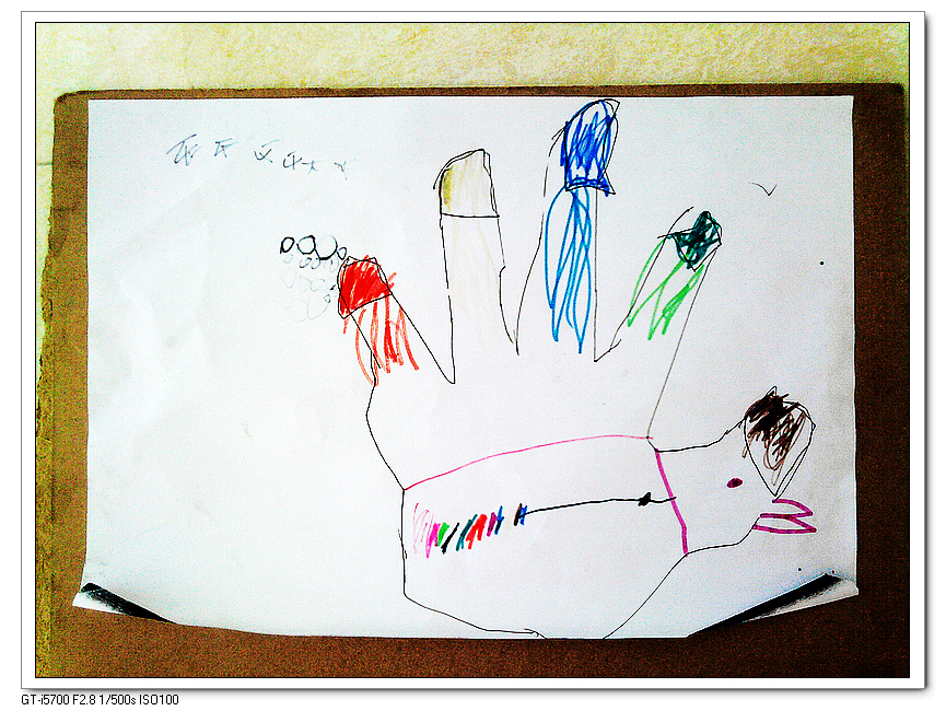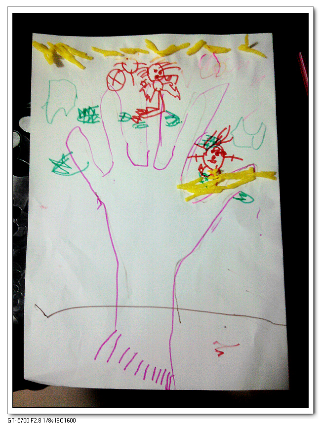 宝宝画的手掌鸟,话说她现在已经开始懂得各种颜色搭配起来才漂亮了,不再像小时候一样,喜欢把所有颜色混在一起,觉得那才美。这两天迷上了画风车,十二个风车叶片,每片一种颜色。这幅画就贴在那块捡来的木板上,不过过完国庆,就被老公扔了……