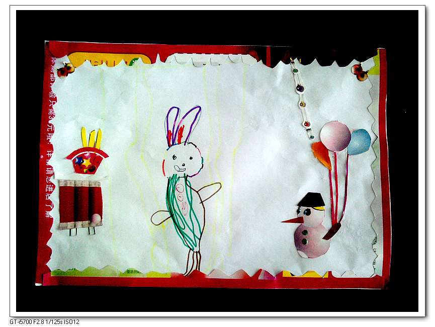这是小兔子荡秋千,这张小兔子是站着的,秋千不明显,在另外一张画上,宝宝特意告诉我,小兔子坐着的地方,秋千被挡住了,看不到,不能画,旁边才能看到。这张的亮点是扣子,每颗扣子中间有一条短线,是固定扣子的线。