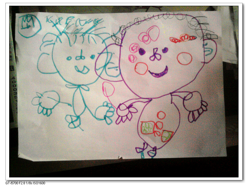 宝宝画得,她和她的好朋友,这张画,鼻子和耳廓是亮点,她还用碳素笔画过一张,那张鼻梁鼻翼更像,可惜被她涂乱了。