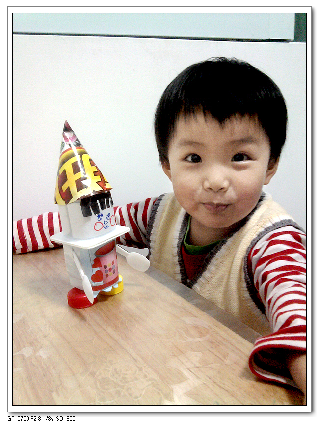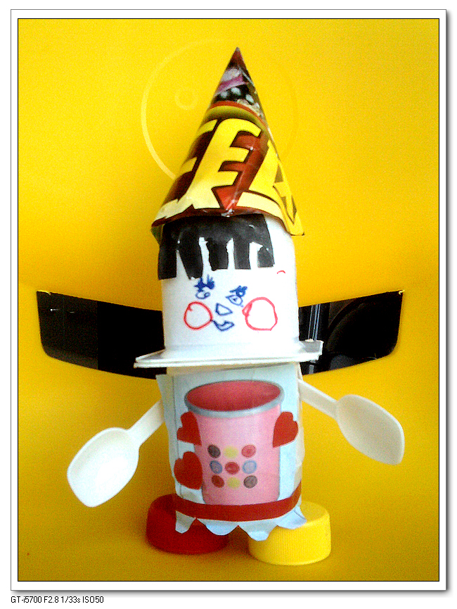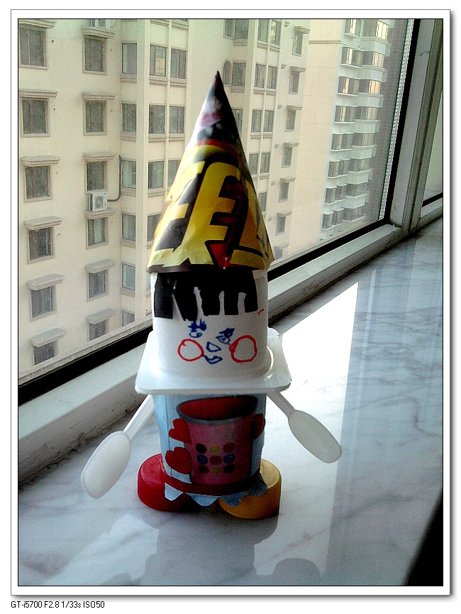 手头只有一张楼下便利店的宣传页,都是土豆鸡蛋洗衣粉什么的,找了半天才找到一个垃圾桶的画面还算漂亮,剪下来当了娃娃的衣服——衣服是按照宝宝的设计图完成的,她特别强调了下面的波浪裙边。剩下的做了两顶帽子,一顶船帽,一顶尖帽,我喜欢船帽,宝宝却喜欢尖帽。