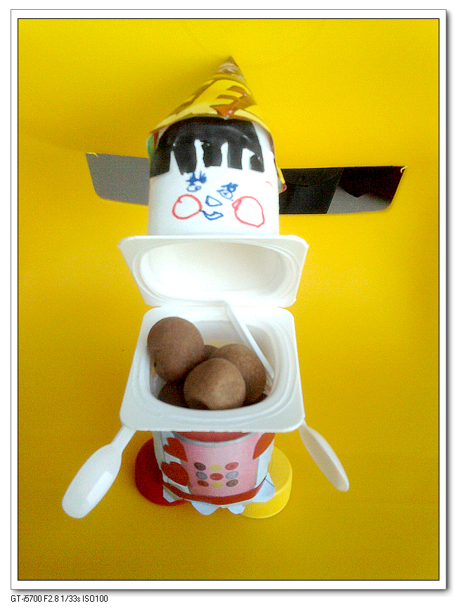 宝宝很喜欢喝酸奶,酸奶盒子可一向是个不错的手工材料。把酸奶盒子的外衣剥掉,剥第二个的时候才想到不应该剥太干净了——原包装下面的那层白纸可以让宝宝用颜料笔直接画。一如既往的红脸蛋,我最喜欢这个娃娃的地方,是它那长长的眉毛,让娃娃的表情变得可爱起来。