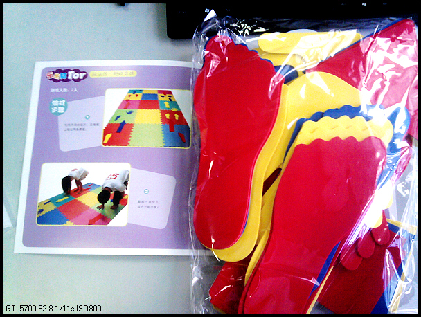 这个教具是我打开包装盒的时候,第一个映入眼帘的,吓我一跳,好大的脚丫啊,哈哈。原来是感统教具,背面有不干胶,可以贴在地垫上,让孩子锻炼爬行,也可以大人跟孩子一起走、爬,还可以跟跳舞毯似的,发布指令,协调动作。EVA质量,防水,可以贴在浴室的墙上玩,还挺漂亮。
