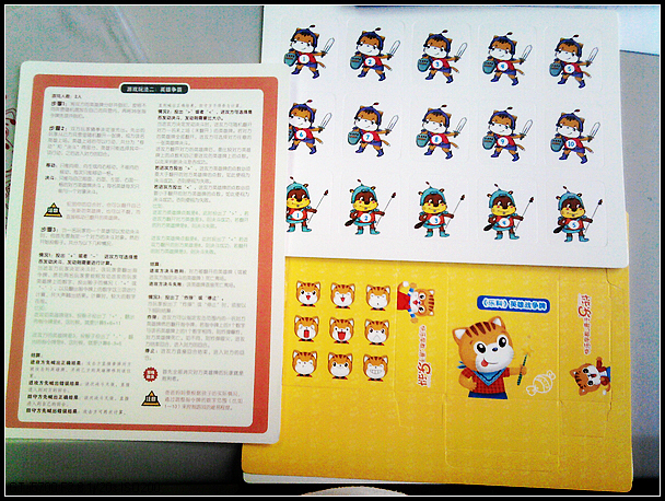 有卡纸有贴纸,这是什么啊?哦,原来是亲子教具——《乐科》英雄战争牌。2人以上就可以玩,玩的过程中,还能学习<和>,哈哈,让我研究研究规则,貌似不难,唔,应该说,肯定不难,跟3-6岁孩子玩的嘛。