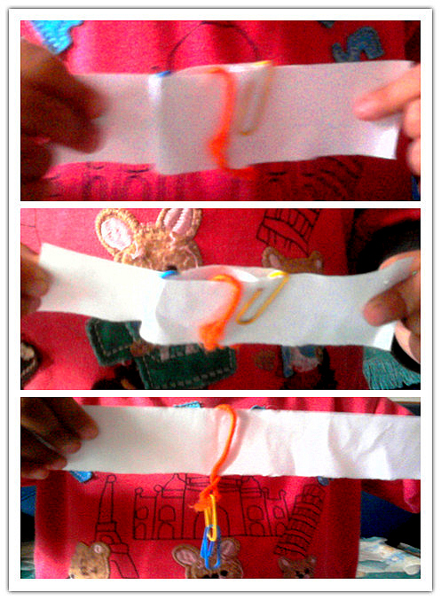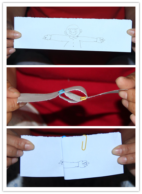 然后快速拉动纸条,两个小伙伴飞到了空中。哈哈,看!它们的手又紧紧拉在了一起。