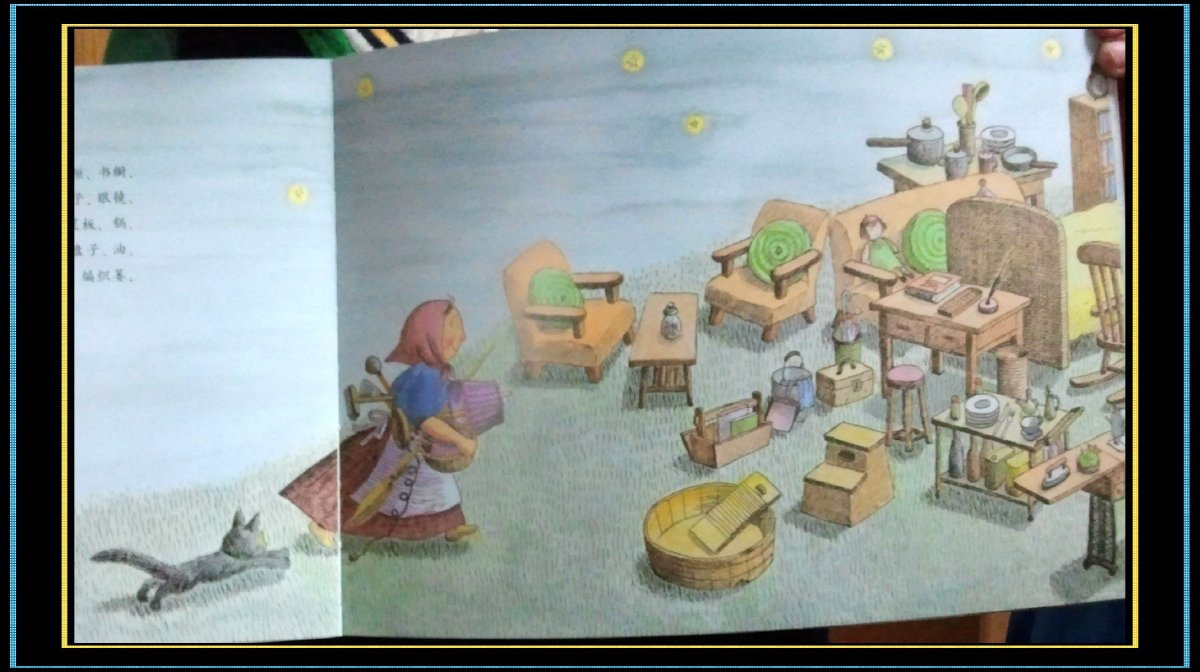 给女儿读这个故事的时候,开始巴巴奶奶从家里搬出来摇椅、床什么的,女儿都只是在认真的听,当讲到搬桌子、拖炉灶和冰箱,女儿就呵呵笑起来。