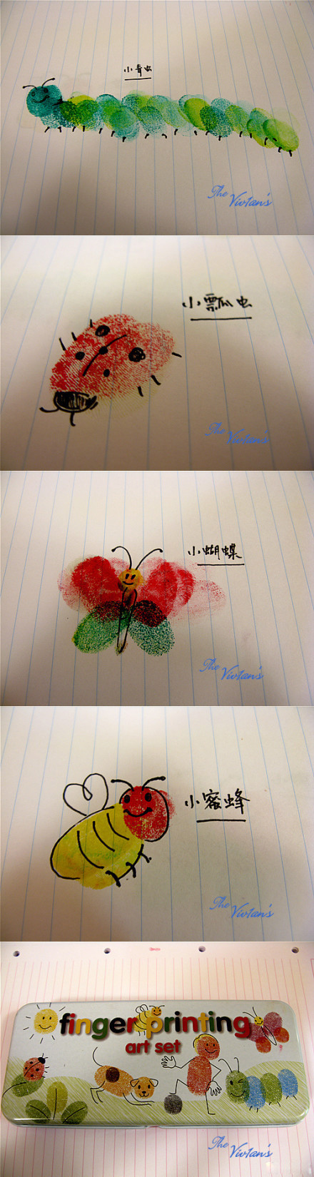 看到一组手指画,创作起来也挺简单的,手指摁几下,再在上面勾描几下就大功告成了。妈妈们可以留着跟宝贝们一起玩哦~