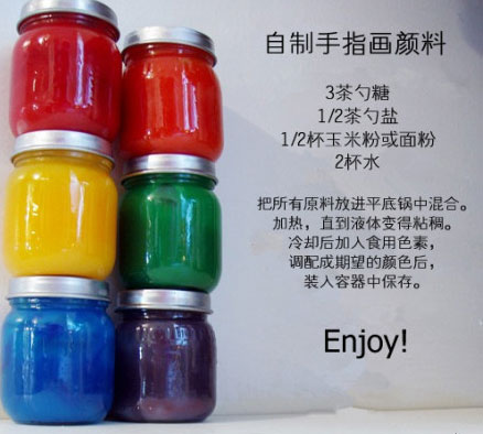 看到这组图片是不是也跃跃欲试呢,给亲们在网上找了一些自制安全手指画颜料的方法。