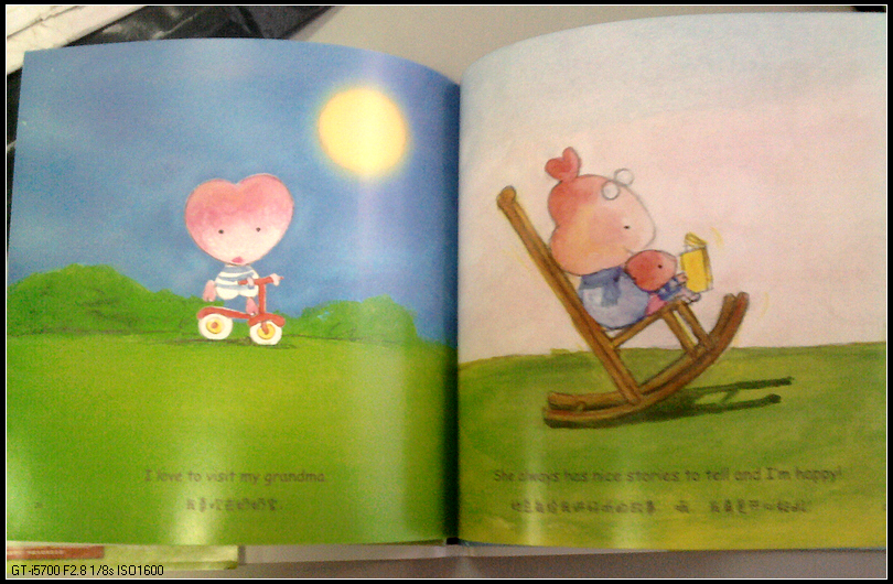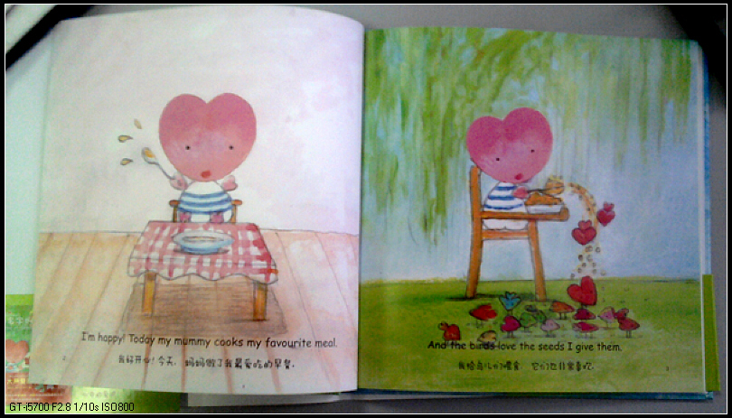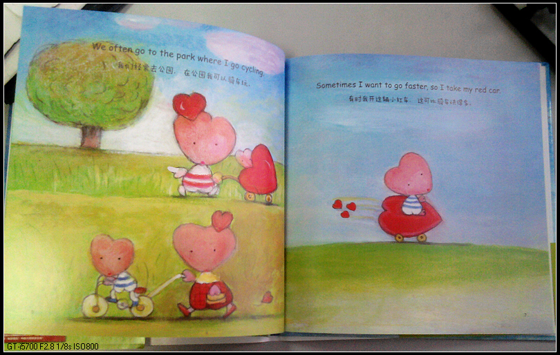 打开扉页,一个可爱的桃心宝宝摇摇晃晃得走来,脸、身体、手臂都是心型,慢慢翻开内页,到处充满了桃心,桃心气球,桃心小车,桃心花瓣,最可爱的,是桃心小鸟。这本书整体的颜色,以蓝、绿、粉红居多,清新漂亮。随书附赠贺卡两张,一如书的风格,甜蜜、温馨、可爱。特别喜欢这种与书相关的卡片,仿佛与作者拉近了距离。