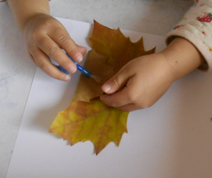 手工制作马上开始。宝宝找到了合适的树叶,先拿出一片作鱼尾巴的树叶,把胶水涂到这片树叶上,但是由于这片叶子太大了,宝宝好像总是涂不完整,我便指点了她一下。然后,宝宝把这片树叶粘到了纸上。这样,鱼的尾巴就做好了,下面是身体了。还是同样的方法,宝宝把鱼的身体也粘好后,便开始做嘴里吐出的水泡。在这个时候,宝宝的一个动作让我感到吃惊,宝宝正在用肘部按粘在纸上的树叶,起到固定作用,而不是用手去做这个环节,真的是很会动脑筋。