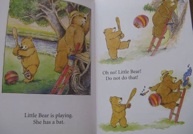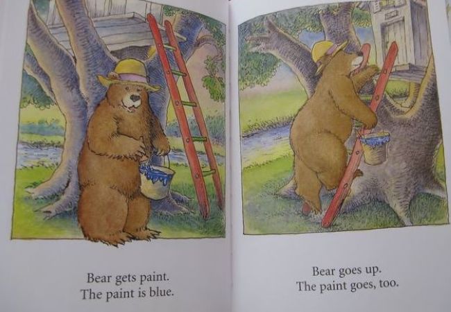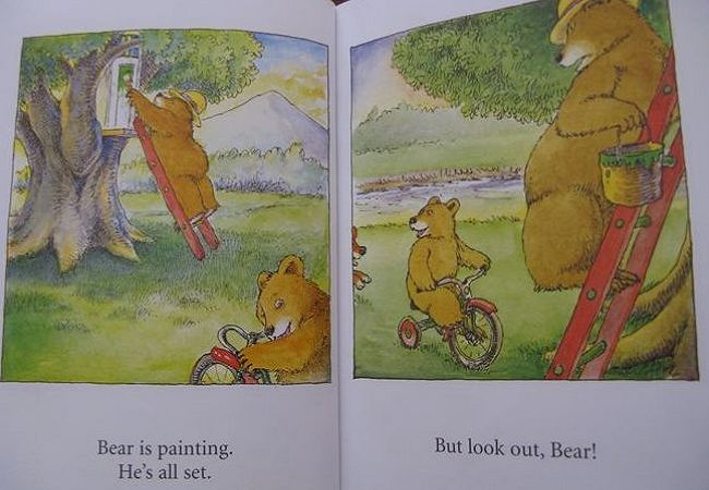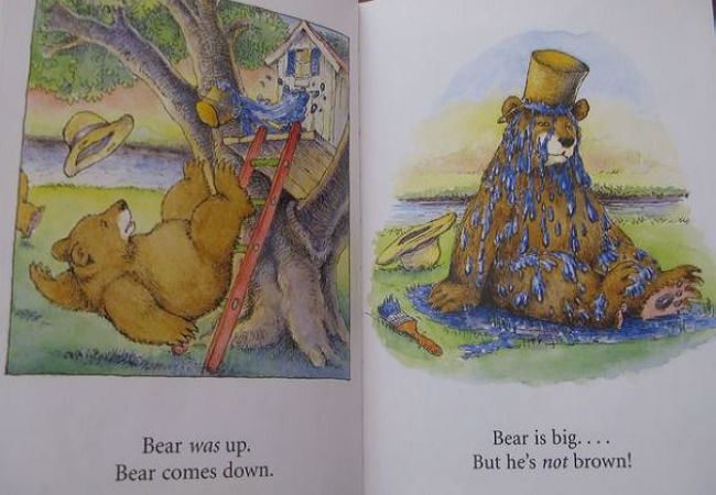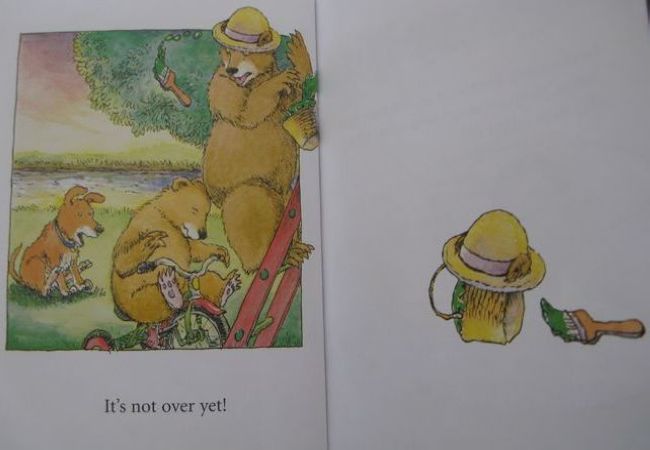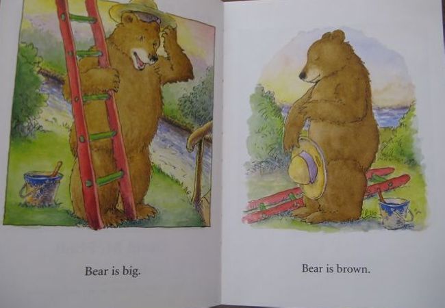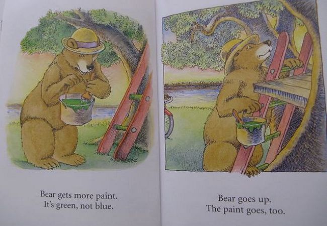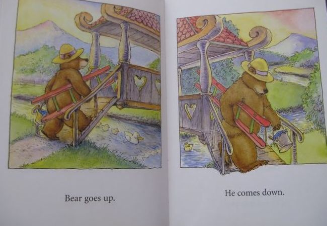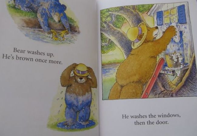 书中的单词都很简单,其中的bear,blue,green,up,down等主要单词,女儿都已经会了,所以我第一次就选择全英文通读,并配合上必要的动作。当通读结束后,我问了女儿一个问题“最后大熊怎么了?”女儿答“大熊变成green,又要重新wash了”。又学会了一个新单词“wash”,而且比我预期中的答案还多了一个需要重新洗一洗了,我原本以为她只会回答大熊变成绿色了。看来以后我不能总拿成人的思维来框定孩子的答案,也要善待她偶尔的“不知道”。
