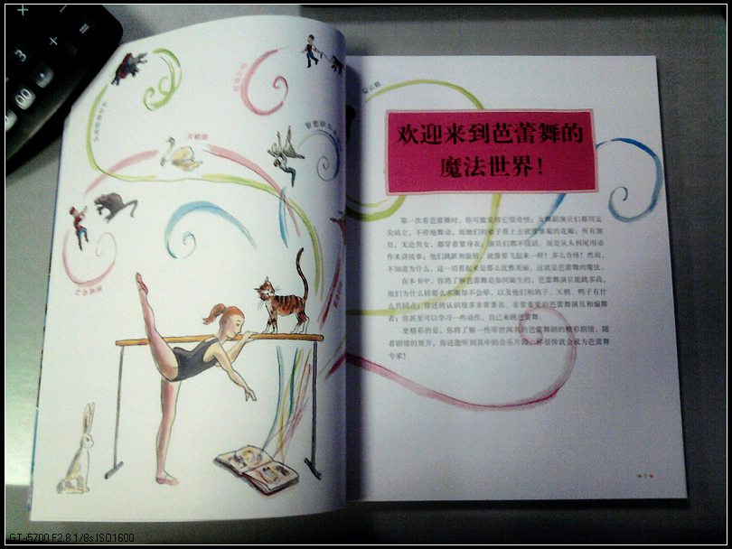 再翻开,——欢迎来到芭蕾舞的魔法世界!一个标题就让人沉醉其中,左面的画中,一个女孩子在跳舞,从书本里幻起经典的舞蹈和故事,双重含义——芭蕾舞的世界是魔法的世界,本书可以带你一窥圣境。