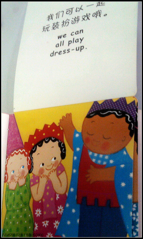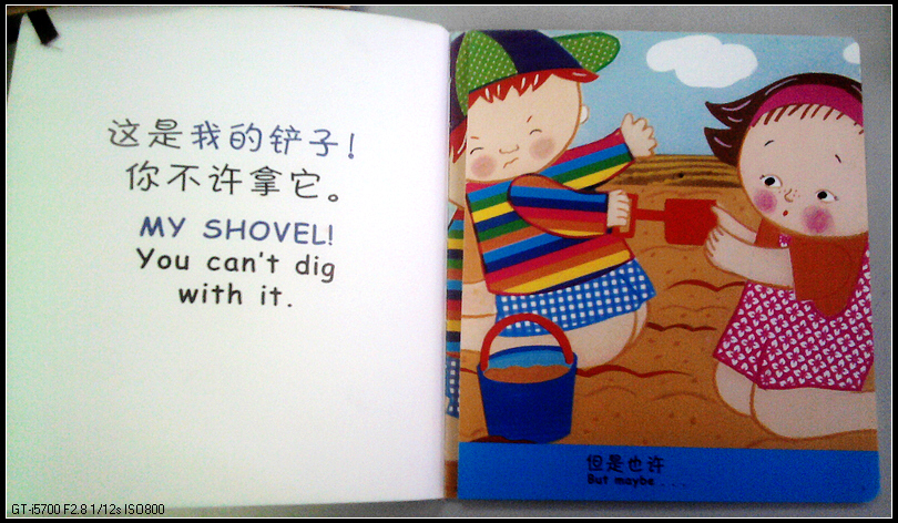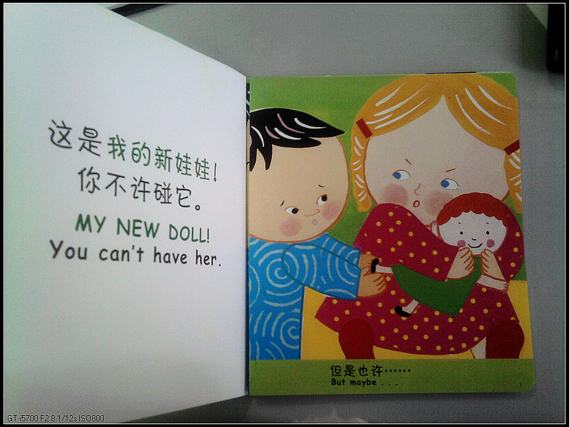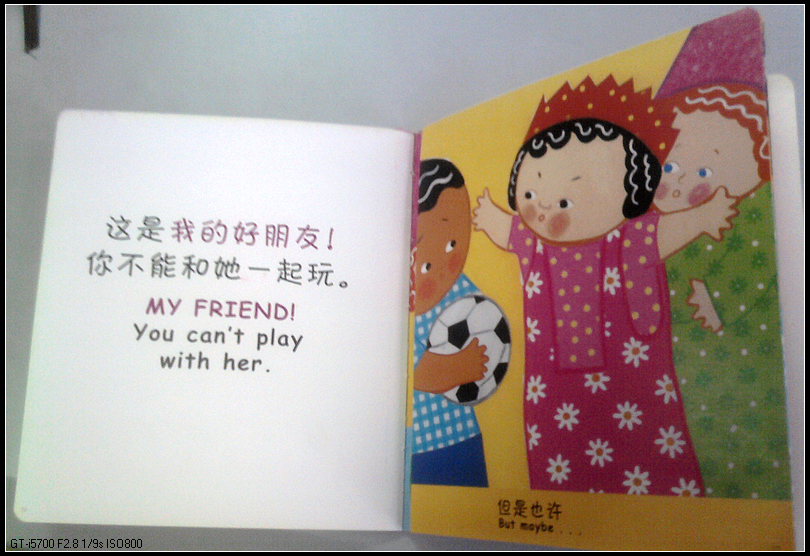 这个翻翻书和我以前见到的不太一样,不过各有千秋。小玻之类的翻翻书,是让小孩子自己发现书中隐藏的翻页,在翻页中寻找秘密;《我可以分享》这本书,是将书页向上展开,给孩子不同的空间感,而且很紧凑的把一件内容联系起来,让每一页成为一个单独的场景和情节,不会因为年龄小而把故事的节奏感打乱。