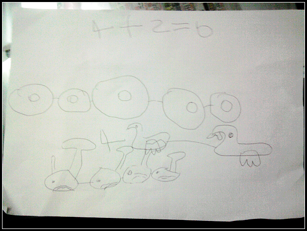 那次在医院里讲《幼儿画报》,里面有个画鲸鱼,大概就是画个豆子,发芽,眼睛,水什么的,宝宝一次就记住了,回来就照着画来给我。没几天,画了下面这幅图,四条鲸鱼,两只鸭子,还写了个算式。