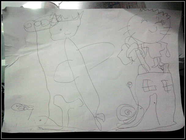 下面这幅图是个很复杂的故事,大意就是一个国王住在城堡里(头上是王冠,手上是权杖),城堡很高,蜗牛都爬不上去。婷却能进去,因为婷能长得很高,比城墙还高。
