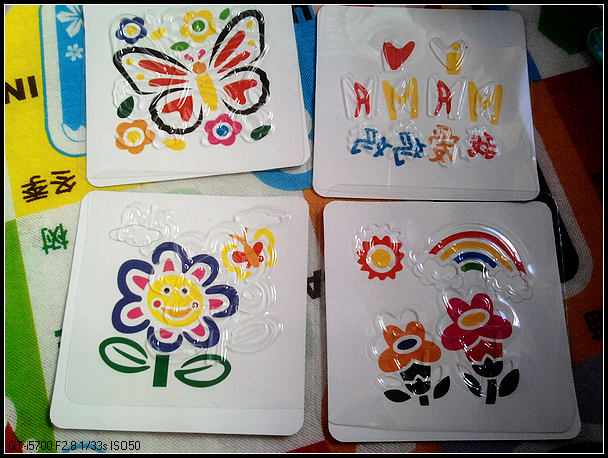 随彩泥配送了4个相框,还有4张彩色的纸和透明塑料膜。塑料膜上有压纹,可以参考配送的图片色彩,制作出漂亮的画来(里面有一幅“我爱妈妈”,这个打动了我的钱包)。图片背后则是简单漂亮的背景图片,可以衬托出效果(可惜我给忘记拍了)。这个创意真棒,没在其他的彩泥上见过。