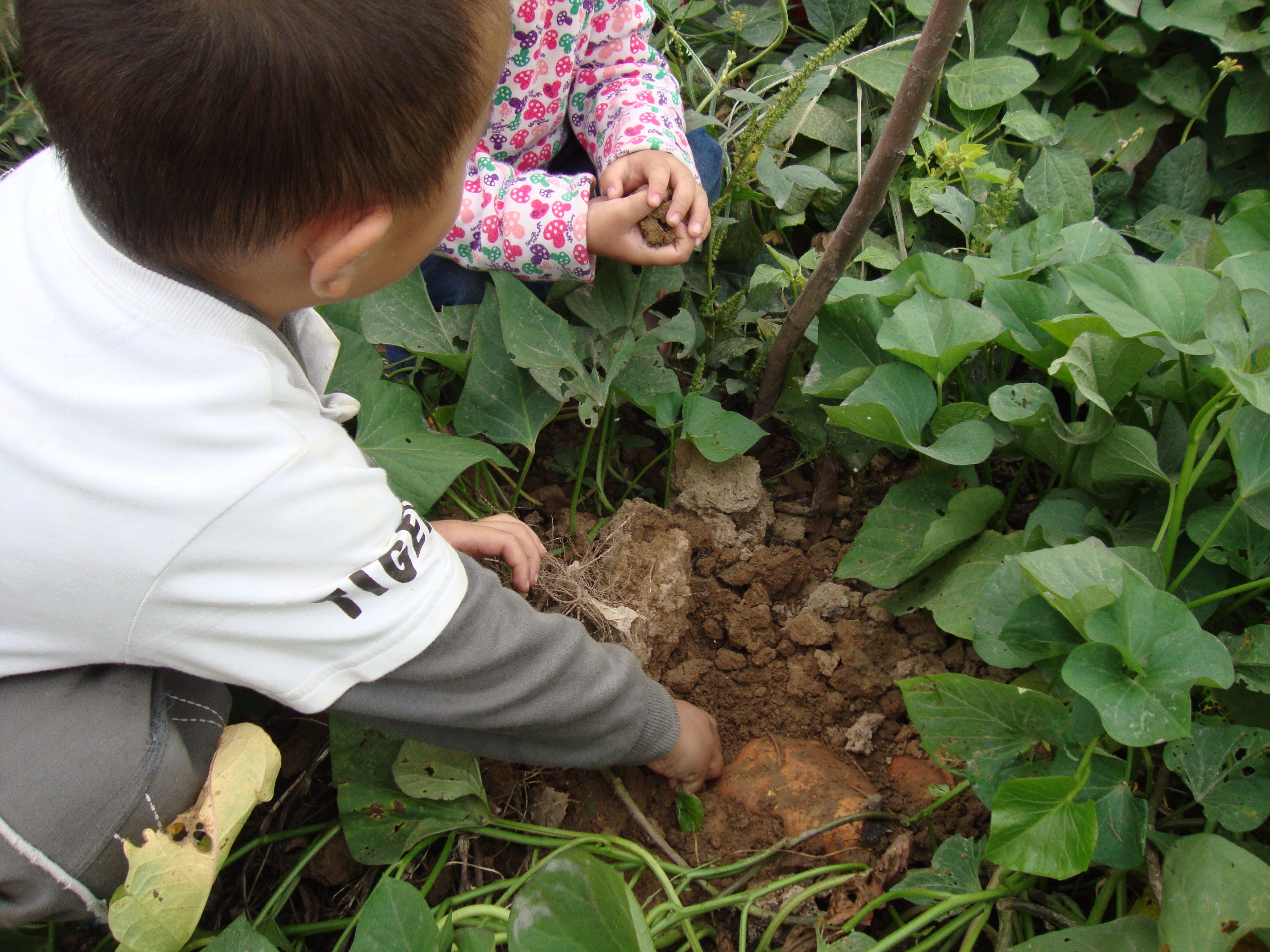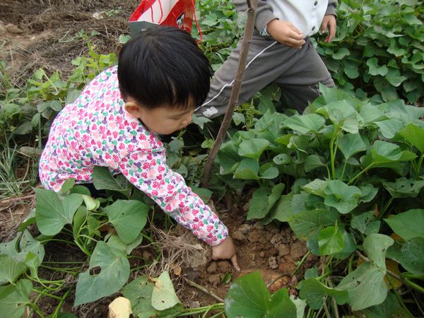 枣摘得差不多的时候,我们看到枣园里还种了一片地瓜。孩子平时最喜欢吃烤地瓜,我们可以趁机让孩子来看下,地瓜是在哪里长大的,地瓜的叶子是什么样子的。