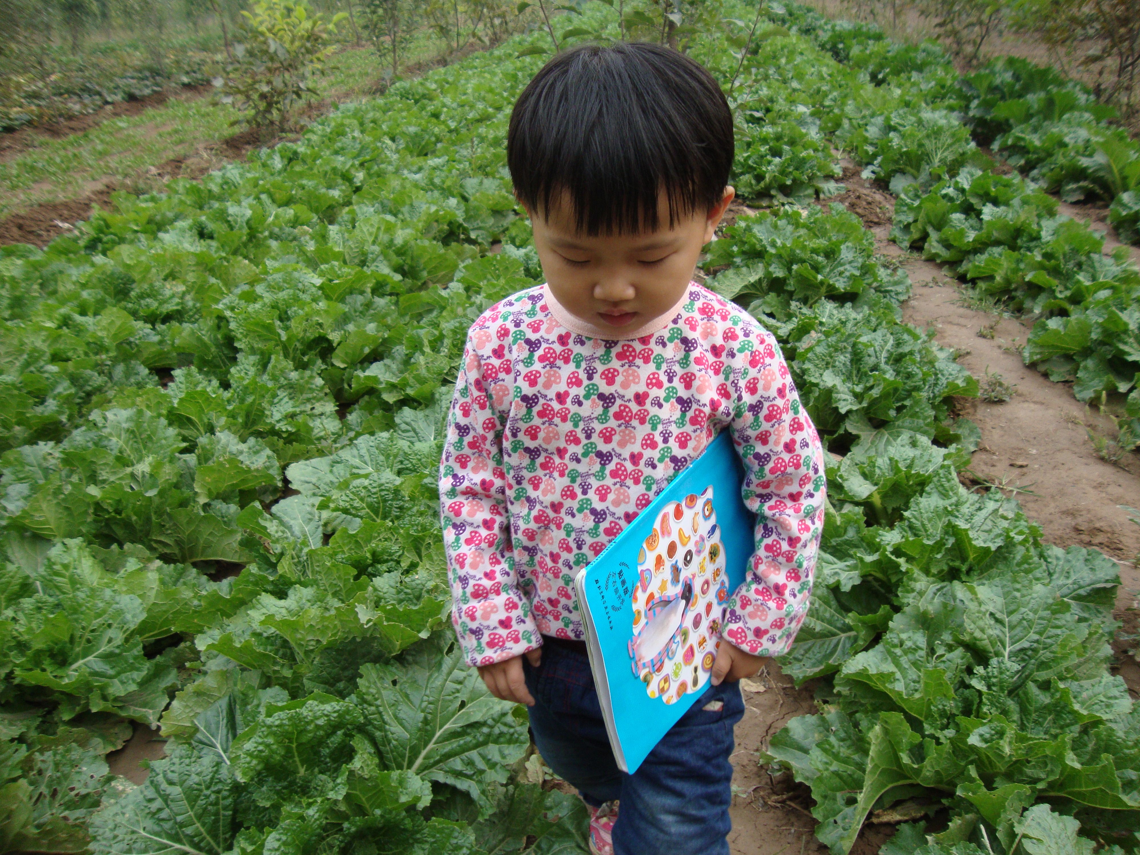这是一片白菜地,远远看去,绿油油的一片,很是养眼,平时我们吃的大白菜就是这样慢慢长大的,孩子也对白菜有了了解。这是萱刚买的一本贴纸书,出门的时候还要拿着。