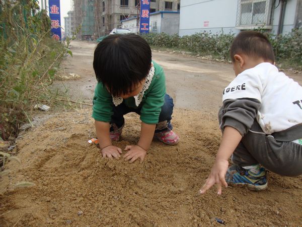 门口堆放了一些沙子,等玩够了园子里的东西后,这堆沙子是孩子们的最爱。