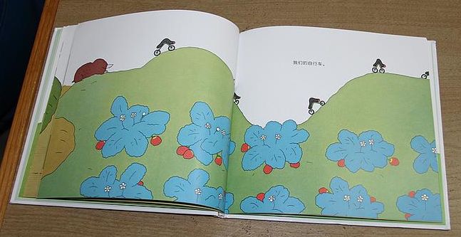 《谁的自行车》,我在网上刚见到的时候,觉得适合比较低龄的孩子开发想象力,可是拿回来翻得越久,感觉越棒。