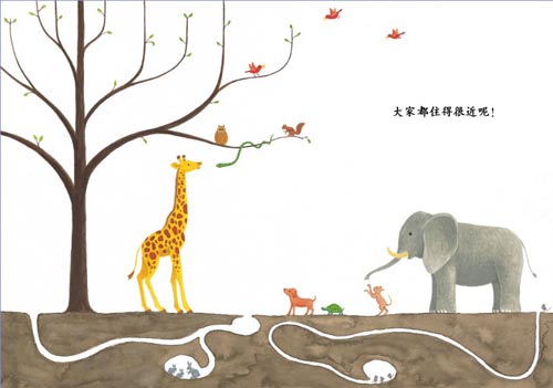 最后上了一张全景图,原来大家住的竟然这么近,简洁的画面体现一种和谐美。而且通过这张图,你会发现,作者对动物们身材的比例抓得很准,帮助孩子们认识高低大小。
