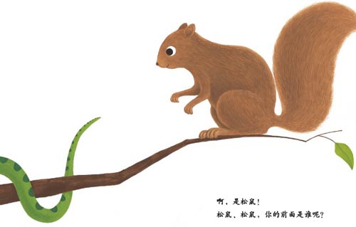 特别是那只小松鼠,感觉就像想用手在叨蛇,非常动态。而猫头鹰起先向一边斜瞄的眼神,感觉是一种对小蛇的不屑——“哼,连我都不认识!”然后眼珠子向下转动,看着长颈鹿,让我感觉到自己能体会出它的心境变化,把故事补充完整,甚至让他们有了心理变化,作者的功力可窥一斑。