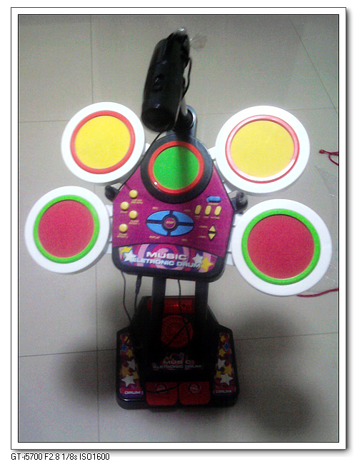 这个架子鼓非常漂亮,说实话当时就是看中了它的颜色(宝宝对颜色鲜艳的东西出奇喜欢)。配有两个鼓槌,蝴蝶形状的黄色、红色和中间那个鼓面可以敲击。上面是麦克,可以取下来。最中间是暂停键。旁边蓝色黄色的按钮有不同的节奏和音效、可以搭配出挺震撼的效果。而且孩子们也非常有兴趣去探索它的效果。
