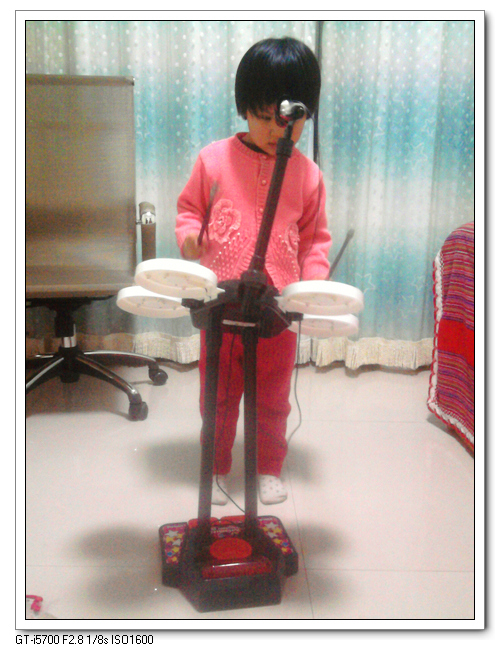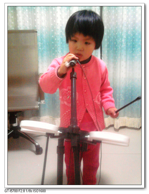 起先宝宝并不太喜欢,我还以为是因为她是女孩子的过——可能男孩子更喜欢架子鼓之类的乐器。但这次回去,她却对架子鼓表现出了超常的兴趣,过一会就会去“叮咣叮咣”敲奏一通,还不让我把音量调小,弄得我战战兢兢,只怕隔音不好,邻居找上门来。