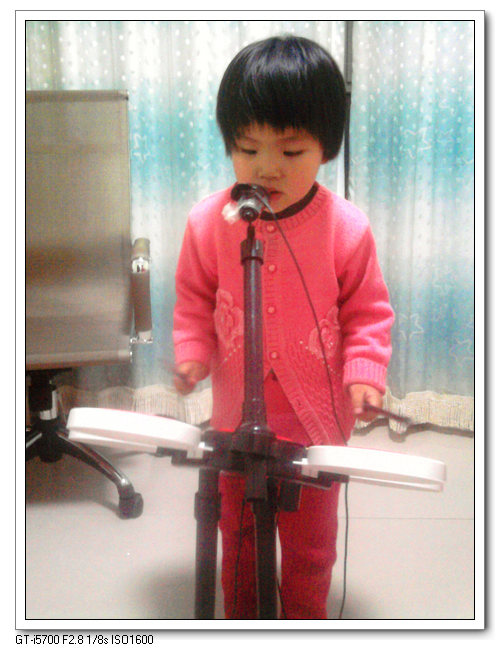 宝宝很喜欢边弹边唱,许多时候还放出鼓自带的音乐来,她跟随节奏在一边扭动。